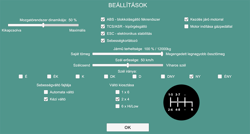 különböző időjárási körülmények, út- és látási viszonyok és ilyen körülmények esetén történő közlekedés szimulálására